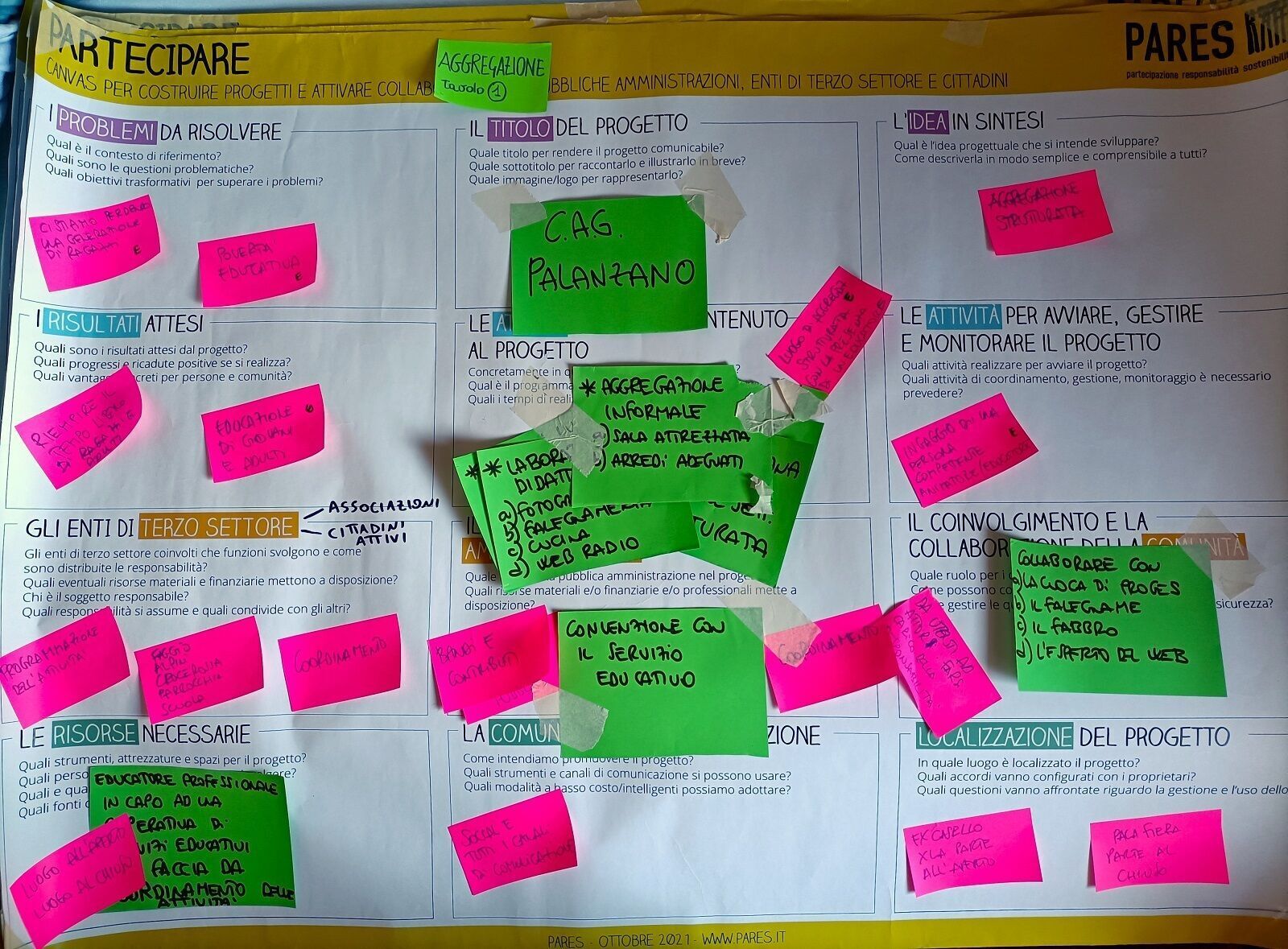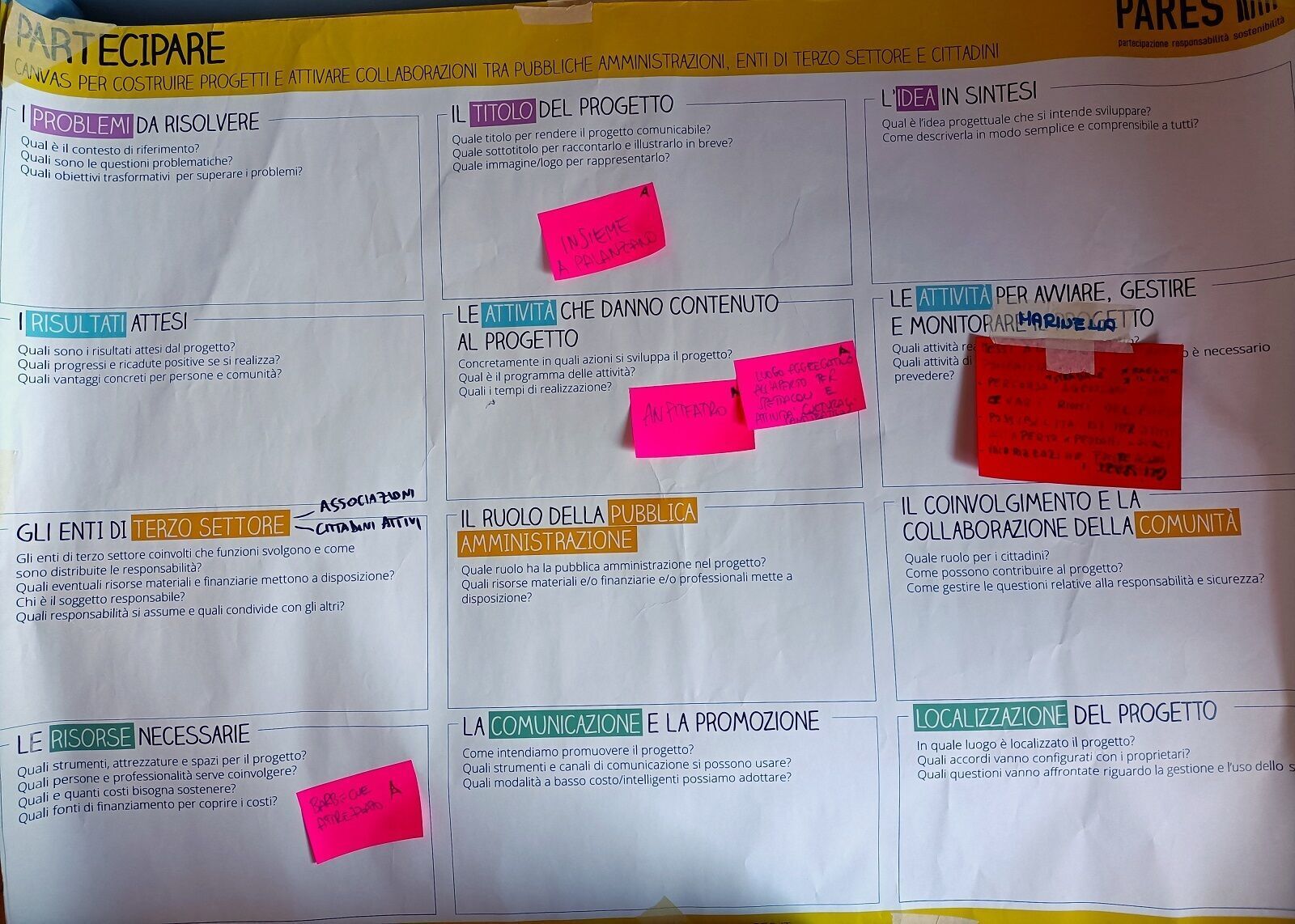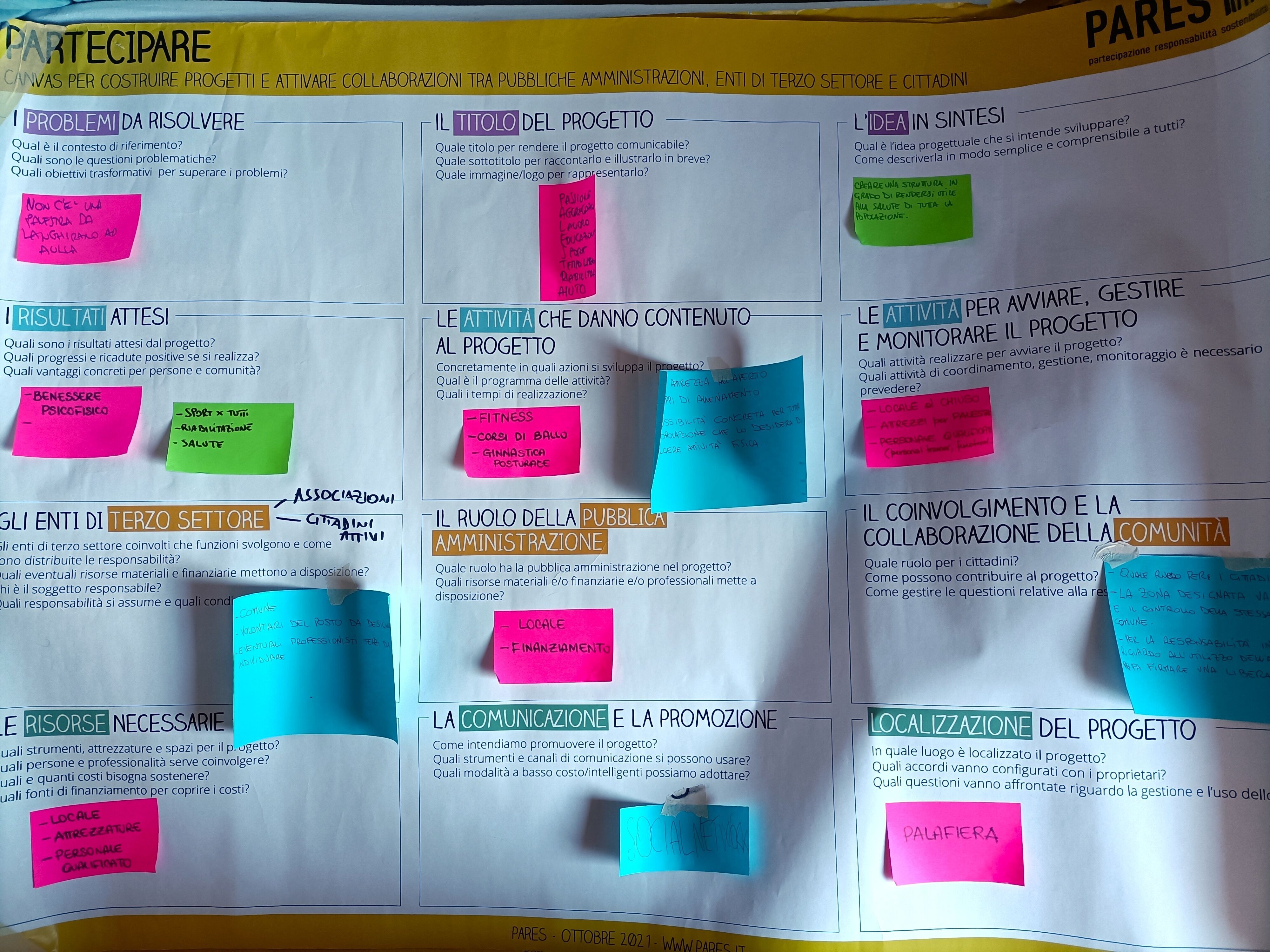 Di seguito i canvas utilizzati per il lavoro di co-progettazione, con gli spunti emersi, che nel prossimo mese verranno sintetizzati e messi a disposizione dell'Amministrazione.